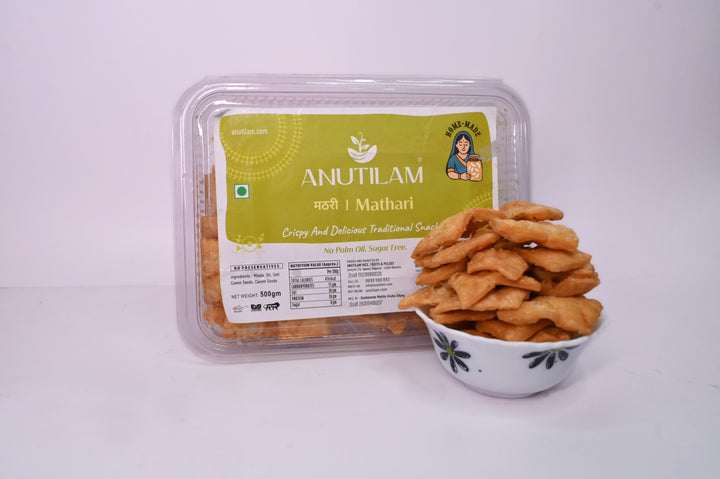 Anutilam’s Mathari (or Mathri) is a popular traditional snack that’s known for its crispy texture and mildly spiced flavor. Made with pure ingredients like maida, carom seeds, and cumin, this snack is the perfect blend of taste and tradition — ideal for pairing with tea or coffee.